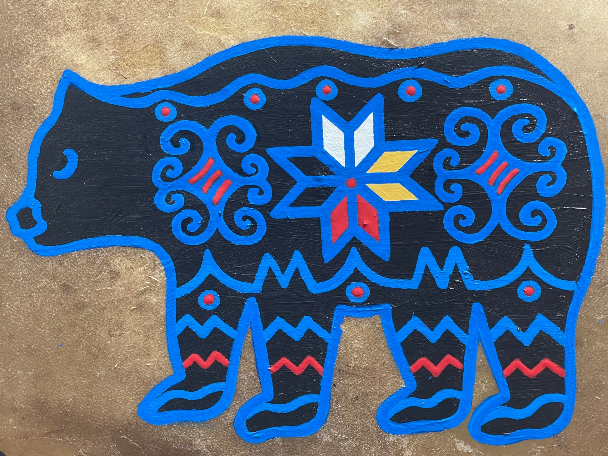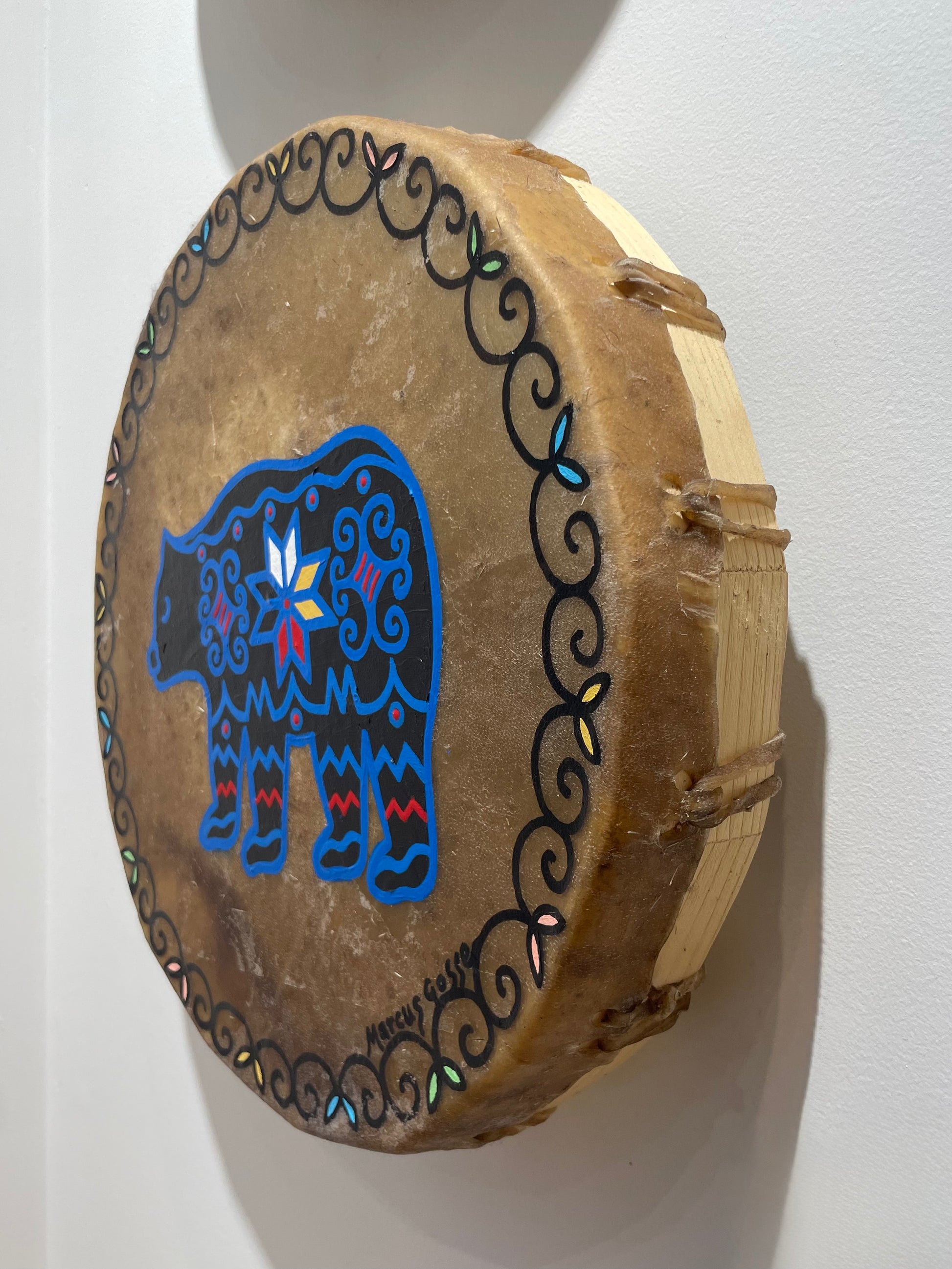 This drum titled “The Bear Strength Drum” displays a bear(muin) showing its strength and determination to embrace the beauty of its environment. The designs within the bear represent embracing your environment, and surrounding cultures. The bear reminds us to live in harmony with nature, our surroundings, and to have the strength and courage to explore our culture. Msit No’kmaq(All My Relations-We Are All Connected).