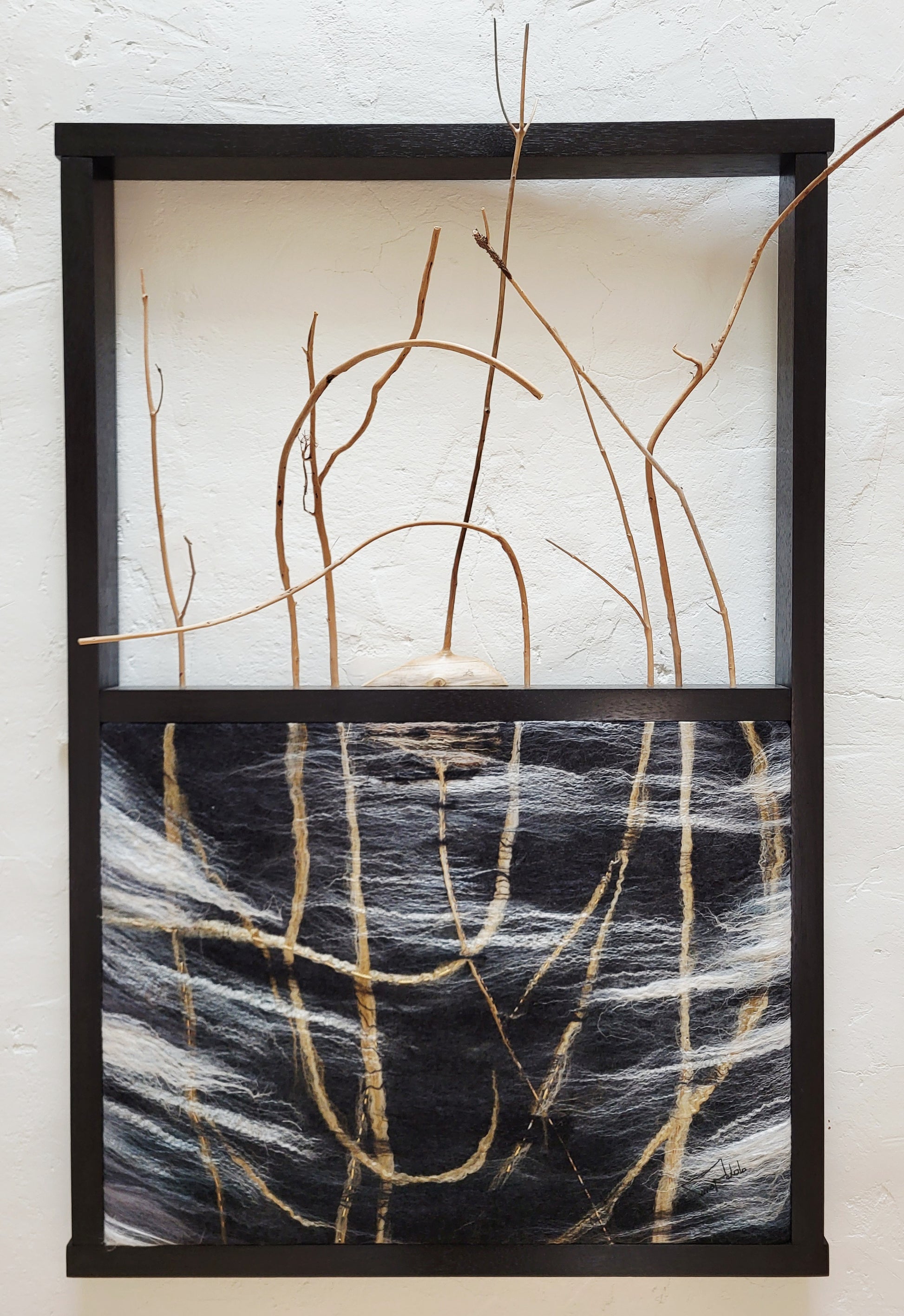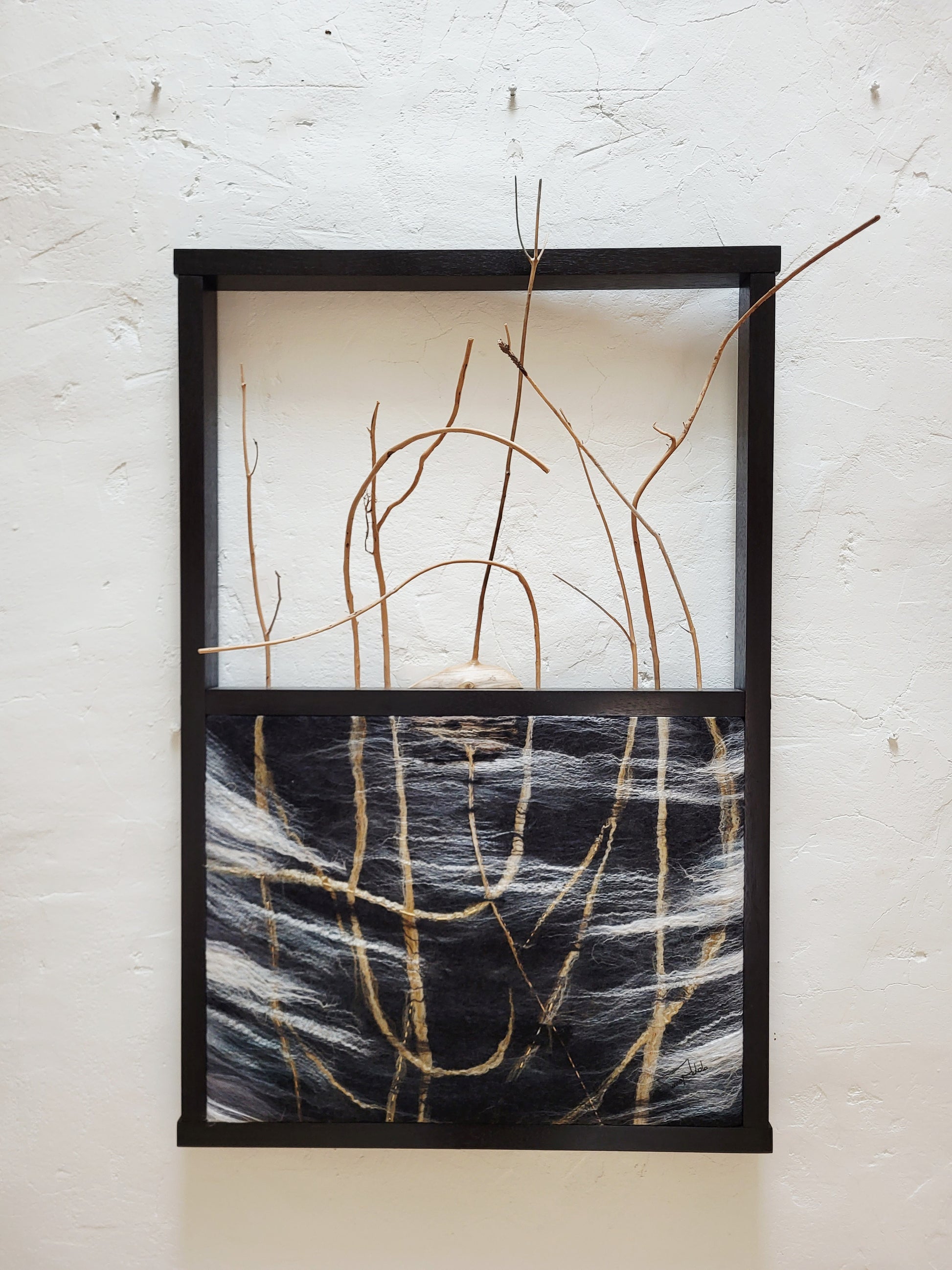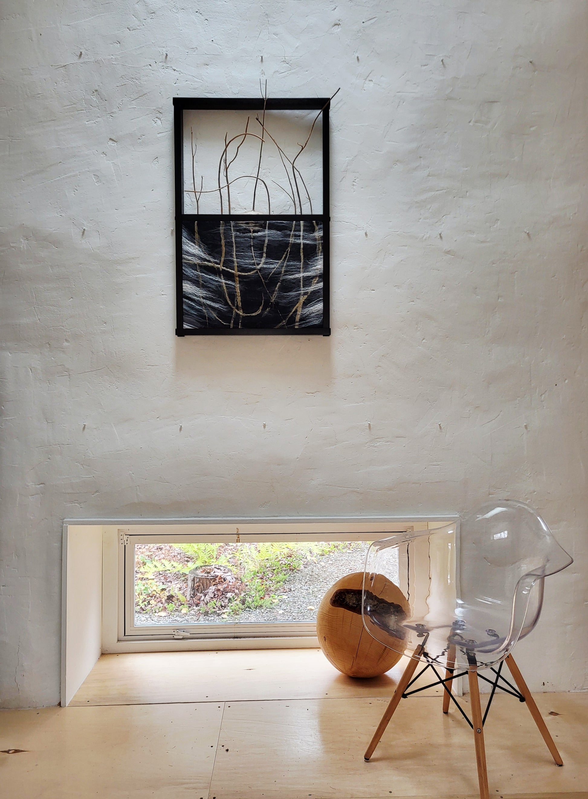 Created by Sanna Rahola using merino wool, linen, silk with spruce details inside a bespoke pickled black walnut frame created by Douglas Drdul.